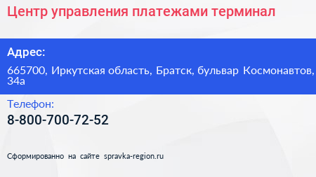 Центр управления платежами, терминал по адресу 665700, Иркутская область, Братск, бульвар Космонавтов, 34а в дальнейшем Организация, размещена в следующих категориях: