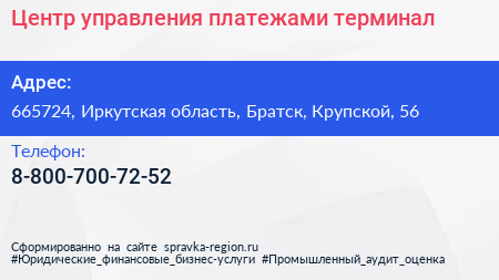 Центр управления платежами, терминал по адресу 665724, Иркутская область, Братск, Крупской, 56 в дальнейшем Организация, размещена в следующих категориях: