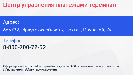 Центр управления платежами, терминал по адресу 665732, Иркутская область, Братск, Крупской, 7а в дальнейшем Организация, размещена в следующих категориях: