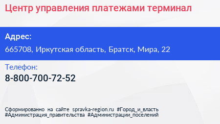 Центр управления платежами, терминал по адресу 665708, Иркутская область, Братск, Мира, 22 в дальнейшем Организация, размещена в следующих категориях: