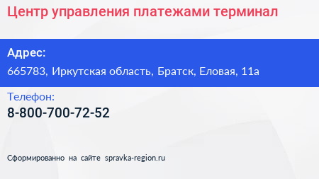 Центр управления платежами, терминал по адресу 665783, Иркутская область, Братск, Еловая, 11а в дальнейшем Организация, размещена в следующих категориях: