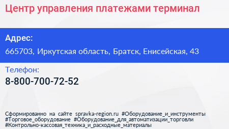 Центр управления платежами, терминал по адресу 665703, Иркутская область, Братск, Енисейская, 43 в дальнейшем Организация, размещена в следующих категориях: