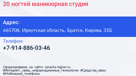 20 ногтей, маникюрная студия по адресу 665708, Иркутская область, Братск, Кирова, 31Б в дальнейшем Организация, размещена в следующих категориях: