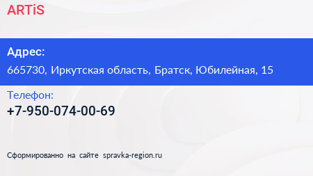 ARTiS по адресу 665730, Иркутская область, Братск, Юбилейная, 15 в дальнейшем Организация, размещена в следующих категориях: