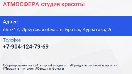 АТМОСФЕРА, студия красоты по адресу 665717, Иркутская область, Братск, Курчатова, 2г в дальнейшем Организация, размещена в следующих категориях: