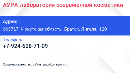 АУРА, лаборатория современной косметики по адресу 665717, Иркутская область, Братск, Янгеля, 120 в дальнейшем Организация, размещена в следующих категориях: