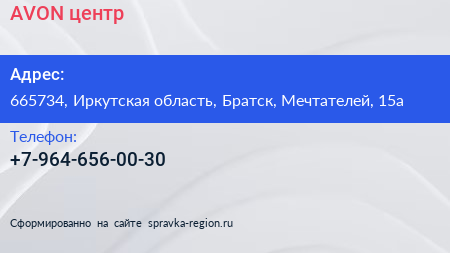 AVON, центр по адресу 665734, Иркутская область, Братск, Мечтателей, 15а в дальнейшем Организация, размещена в следующих категориях: