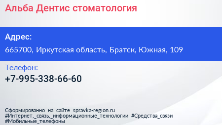 Альба Дентис, стоматология по адресу 665700, Иркутская область, Братск, Южная, 109 в дальнейшем Организация, размещена в следующих категориях: