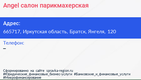 Angel, салон-парикмахерская по адресу 665717, Иркутская область, Братск, Янгеля, 120 в дальнейшем Организация, размещена в следующих категориях: