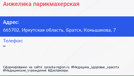 Анжелика, парикмахерская по адресу 665702, Иркутская область, Братск, Коньшакова, 7 в дальнейшем Организация, размещена в следующих категориях:
