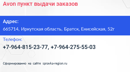 Avon, пункт выдачи заказов по адресу 665714, Иркутская область, Братск, Енисейская, 52г в дальнейшем Организация, размещена в следующих категориях: