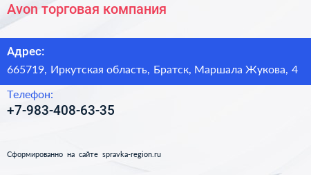 Avon, торговая компания по адресу 665719, Иркутская область, Братск, Маршала Жукова, 4 в дальнейшем Организация, размещена в следующих категориях: