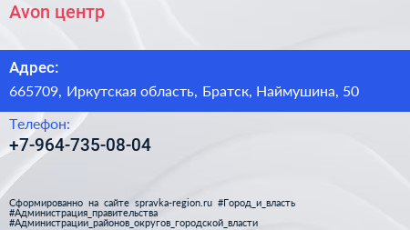 Avon, центр по адресу 665709, Иркутская область, Братск, Наймушина, 50 в дальнейшем Организация, размещена в следующих категориях: