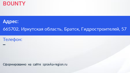 BOUNTY по адресу 665702, Иркутская область, Братск, Гидростроителей, 57 в дальнейшем Организация, размещена в следующих категориях: