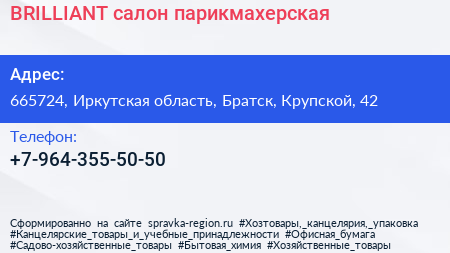 BRILLIANT, салон-парикмахерская по адресу 665724, Иркутская область, Братск, Крупской, 42 в дальнейшем Организация, размещена в следующих категориях: