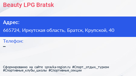 Beauty LPG Bratsk по адресу 665724, Иркутская область, Братск, Крупской, 40 в дальнейшем Организация, размещена в следующих категориях: