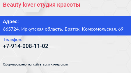Beauty lover, студия красоты по адресу 665724, Иркутская область, Братск, Комсомольская, 69 в дальнейшем Организация, размещена в следующих категориях: