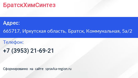 БратскХимСинтез по адресу 665717, Иркутская область, Братск, Коммунальная, 5а/2 в дальнейшем Организация, размещена в следующих категориях: