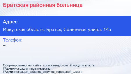 Братская районная больница по адресу Иркутская область, Братск, Солнечная улица, 14а в дальнейшем Организация, размещена в следующих категориях: