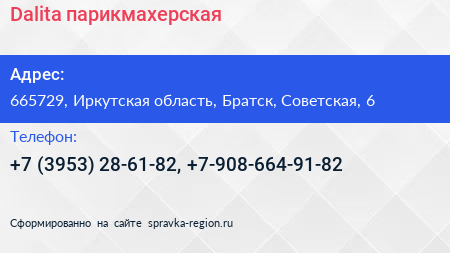Dalita, парикмахерская по адресу 665729, Иркутская область, Братск, Советская, 6 в дальнейшем Организация, размещена в следующих категориях: