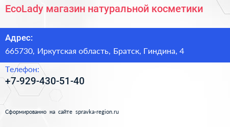 EcoLady, магазин натуральной косметики по адресу 665730, Иркутская область, Братск, Гиндина, 4 в дальнейшем Организация, размещена в следующих категориях: