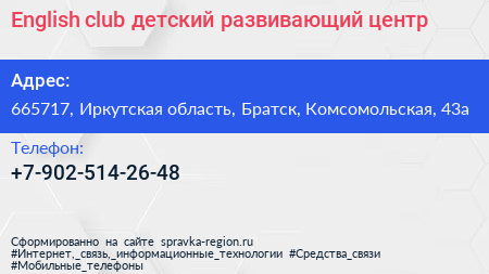 English club, детский развивающий центр по адресу 665717, Иркутская область, Братск, Комсомольская, 43а в дальнейшем Организация, размещена в следующих категориях: