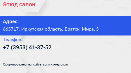 Этюд, салон по адресу 665717, Иркутская область, Братск, Мира, 5 в дальнейшем Организация, размещена в следующих категориях: