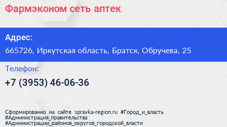 Фармэконом, сеть аптек по адресу 665726, Иркутская область, Братск, Обручева, 25 в дальнейшем Организация, размещена в следующих категориях:
