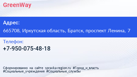 GreenWay по адресу 665708, Иркутская область, Братск, проспект Ленина, 7 в дальнейшем Организация, размещена в следующих категориях: