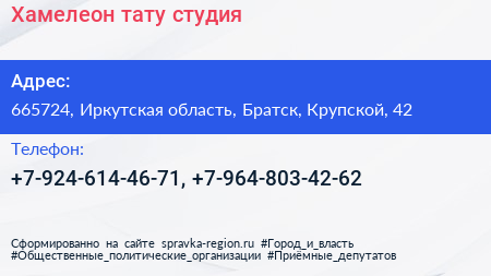 Хамелеон, тату-студия по адресу 665724, Иркутская область, Братск, Крупской, 42 в дальнейшем Организация, размещена в следующих категориях: