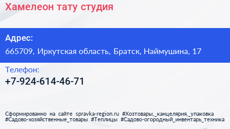Хамелеон, тату-студия по адресу 665709, Иркутская область, Братск, Наймушина, 17 в дальнейшем Организация, размещена в следующих категориях: