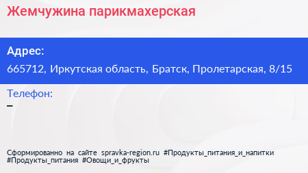 Жемчужина, парикмахерская по адресу 665712, Иркутская область, Братск, Пролетарская, 8/15 в дальнейшем Организация, размещена в следующих категориях: