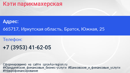Кэти, парикмахерская по адресу 665717, Иркутская область, Братск, Южная, 25 в дальнейшем Организация, размещена в следующих категориях: