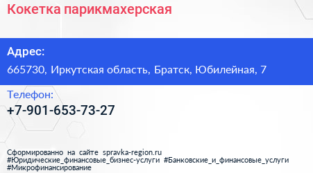 Кокетка, парикмахерская по адресу 665730, Иркутская область, Братск, Юбилейная, 7 в дальнейшем Организация, размещена в следующих категориях: