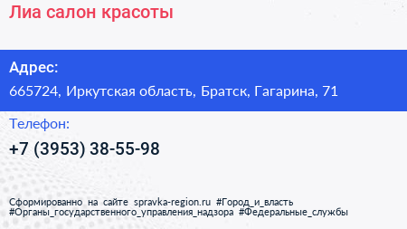 Лиа, салон красоты по адресу 665724, Иркутская область, Братск, Гагарина, 71 в дальнейшем Организация, размещена в следующих категориях: