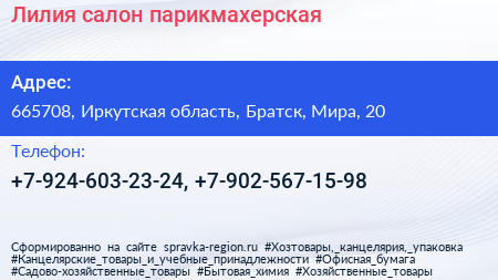 Лилия, салон-парикмахерская по адресу 665708, Иркутская область, Братск, Мира, 20 в дальнейшем Организация, размещена в следующих категориях: