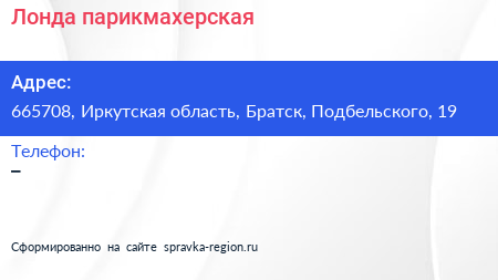 Лонда, парикмахерская по адресу 665708, Иркутская область, Братск, Подбельского, 19 в дальнейшем Организация, размещена в следующих категориях:
