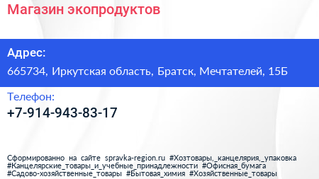 Магазин экопродуктов по адресу 665734, Иркутская область, Братск, Мечтателей, 15Б в дальнейшем Организация, размещена в следующих категориях: