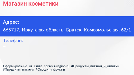 Магазин косметики по адресу 665717, Иркутская область, Братск, Комсомольская, 62/1 в дальнейшем Организация, размещена в следующих категориях: