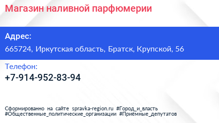 Магазин наливной парфюмерии по адресу 665724, Иркутская область, Братск, Крупской, 56 в дальнейшем Организация, размещена в следующих категориях: