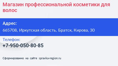 Магазин профессиональной косметики для волос по адресу 665708, Иркутская область, Братск, Кирова, 30 в дальнейшем Организация, размещена в следующих категориях: