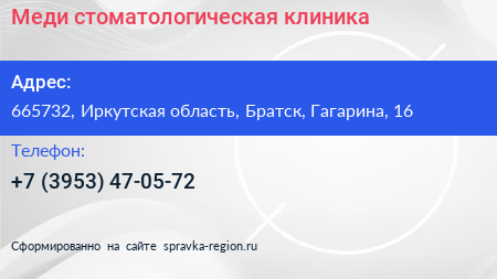 Меди, стоматологическая клиника по адресу 665732, Иркутская область, Братск, Гагарина, 16 в дальнейшем Организация, размещена в следующих категориях: