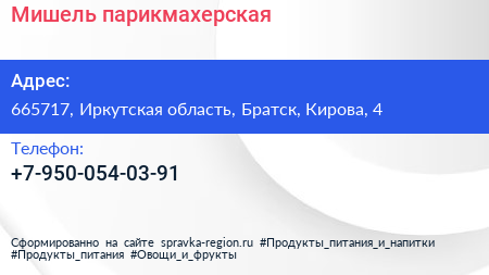 Мишель, парикмахерская по адресу 665717, Иркутская область, Братск, Кирова, 4 в дальнейшем Организация, размещена в следующих категориях:
