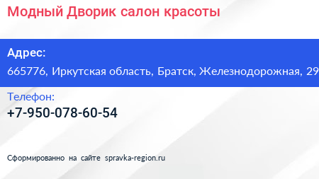 Модный Дворик, салон красоты по адресу 665776, Иркутская область, Братск, Железнодорожная, 29 в дальнейшем Организация, размещена в следующих категориях: