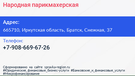 Народная, парикмахерская по адресу 665710, Иркутская область, Братск, Снежная, 37 в дальнейшем Организация, размещена в следующих категориях: