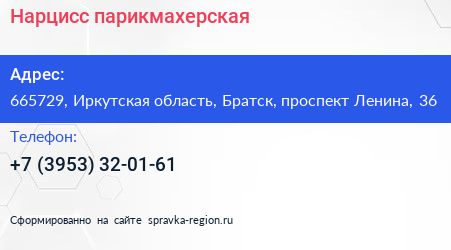 Нарцисс, парикмахерская по адресу 665729, Иркутская область, Братск, проспект Ленина, 36 в дальнейшем Организация, размещена в следующих категориях:
