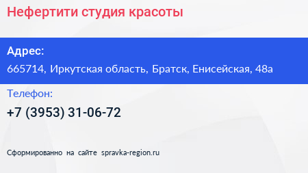Нефертити, студия красоты по адресу 665714, Иркутская область, Братск, Енисейская, 48а в дальнейшем Организация, размещена в следующих категориях: