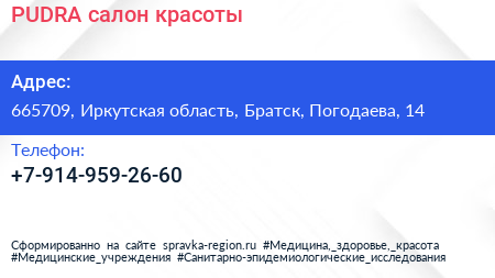 PUDRA, салон красоты по адресу 665709, Иркутская область, Братск, Погодаева, 14 в дальнейшем Организация, размещена в следующих категориях: