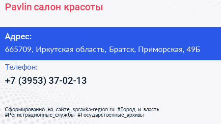 Pavlin, салон красоты по адресу 665709, Иркутская область, Братск, Приморская, 49Б в дальнейшем Организация, размещена в следующих категориях: