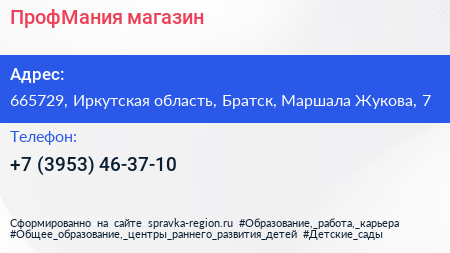 ПрофМания, магазин по адресу 665729, Иркутская область, Братск, Маршала Жукова, 7 в дальнейшем Организация, размещена в следующих категориях: